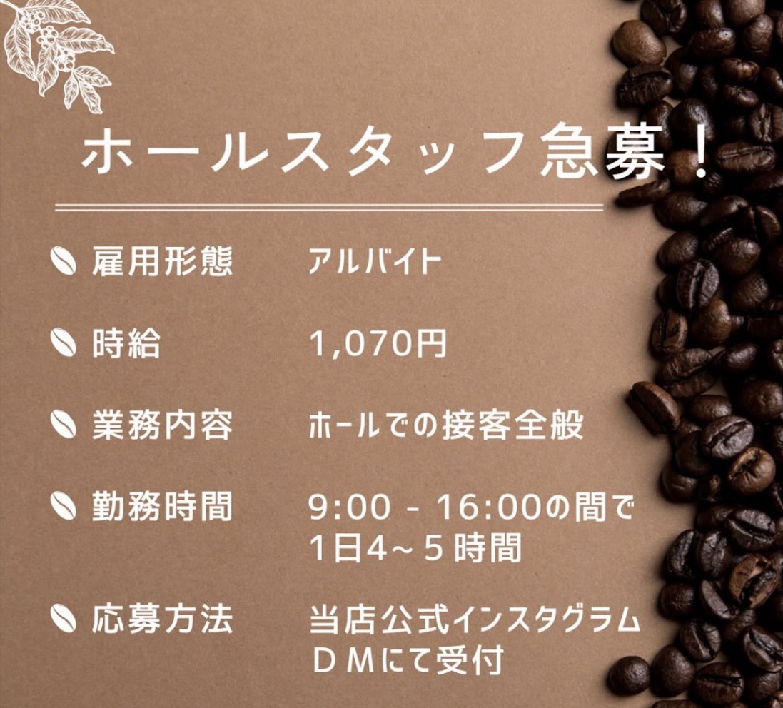 2025年10月4日 / 最終更新日時 : 2025年10月4日 kitchen413 お知らせ ホールスタッフ急募! ■キッチン 椎の実当店で働いてみませんか?今回はホールスタッフの募集です。 まずはお気軽に、当店公式インスタグラムまで、DMにてお問い合わせください。お問い合わせtel.058-372-3776